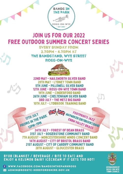 The A. W. Parker (Drybrook) Band are currently contracted by Ross Town Council with organising the programme of performers, having won the three-year contract for 2021-2023 and again for 2024-2026. The weekly concerts are always very well attended and the Bandstand, located beside the Wye in a wide open space, is an enjoyable place to perform and a firm favourite for many bands.