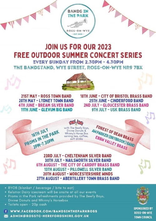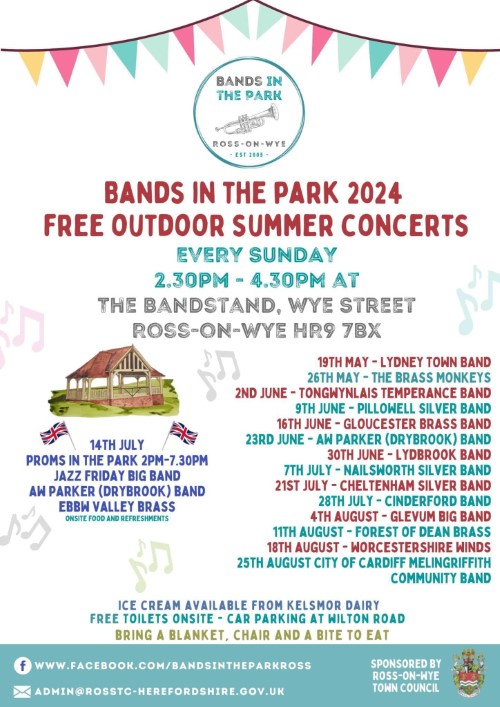 The A. W. Parker (Drybrook) Band are currently contracted by Ross Town Council with organising the programme of performers, having won the three-year contract for 2021-2023 and again for 2024-2026. The weekly concerts are always very well attended and the Bandstand, located beside the Wye in a wide open space, is an enjoyable place to perform and a firm favourite for many bands.